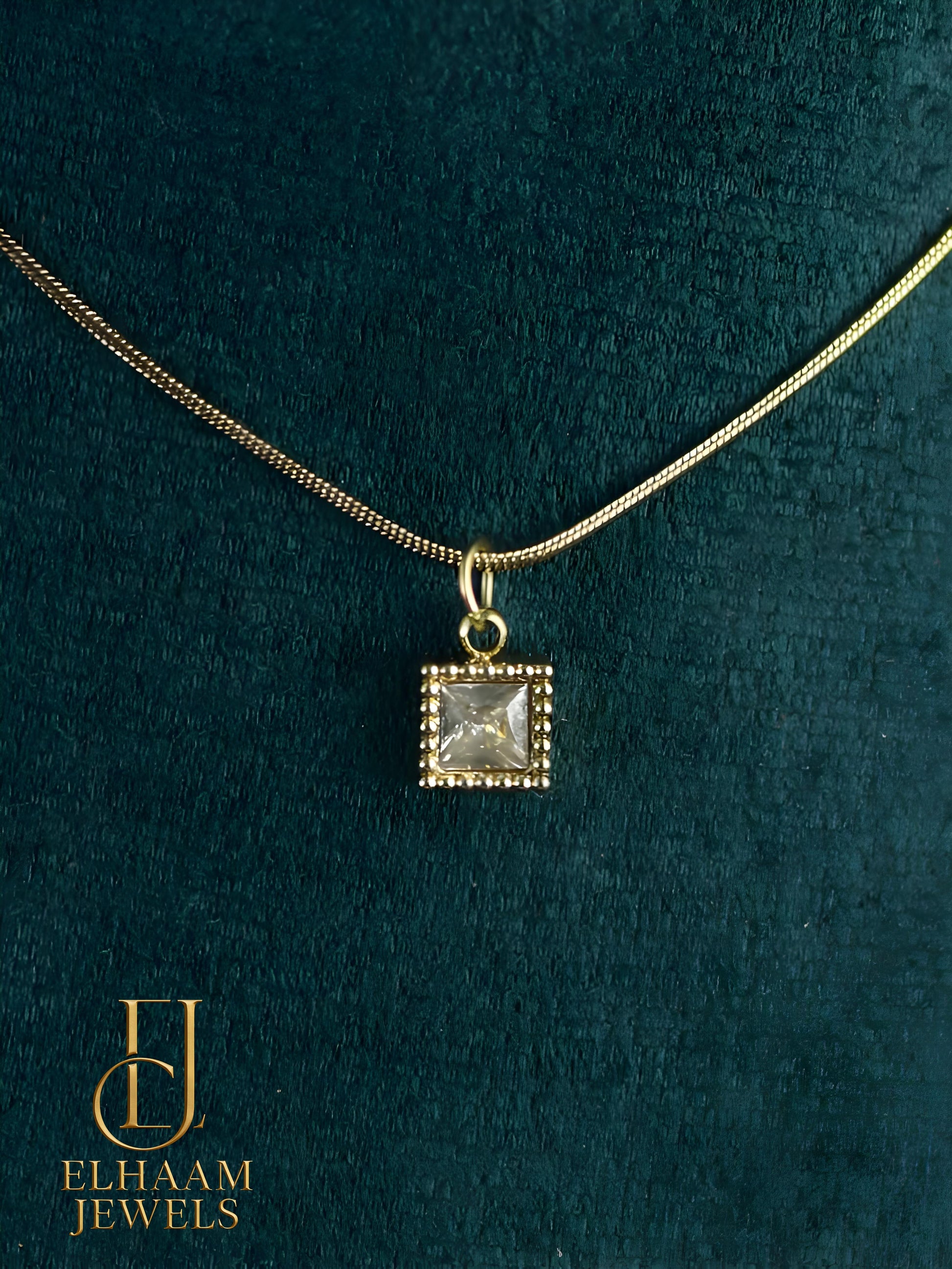 Discover the allure of geometric simplicity with the Minimalist Square Solitaire Set from Elhaam Jewels. This coordinated set, including a necklace and stud earrings, offers refined style with a unique vintage touch.